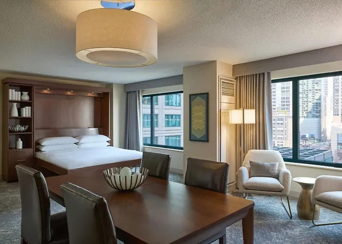 Das 34-stöckige Hotel Sheraton Grand Chicago Riverwalk liegt in circa 10 Gehminuten Entfernung von der U-Bahn-Station Grand entfernt und bietet geräumige Zimmer sowie WLAN in den öffentlichen Bereichen. Das 4-Sterne-Hotel befindet sich im Herzen von Chicago und verfügt über einen Außenpool.